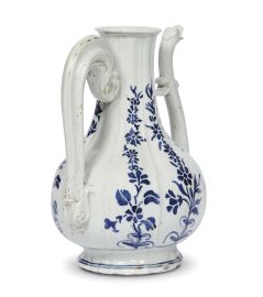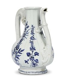 in porcellana, corpo piriforme e costolato, piede rastremato costolato e modanato secondo un modello desunto dall’argenteria; l’ansa alta e mossa è importante, scende sinuosa dal collo fino al corpo; il versatoio termina a forma di testa di serpe con beccuccio aperto, ed è collegato al corpo da una staffa ondulata. Priva di coperchio. La decorazione, in blu di cobalto, interessa con andamento verticale le costolature del corpo, realizzata in maniera finissima nei modi caratteristici del decoro “a stampino”, con l’aggiunta degli steli a mano libera; il piede è orlato di blu; alt. cm 22,7, largh. massima cm 18,5, diam. cm 13,9