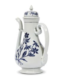 in porcellana, corpo piriforme con piede rastremato e modanato secondo un modello desunto dall’argenteria, ansa alta e mossa, versatore terminante a forma di testa di serpe con beccuccio aperto, collegato al corpo da una staffa doppia ondulata e arricchito alla base da un decoro a rilievo; il coperchio è a cupola, con pomolo di restauro. Il decoro in blu di cobalto interessa il corpo dell’oggetto con un unico mazzo di fori, coerente sul coperchio. La caffettiera mostra alcuni difetti di cottura con bollitura della vetrina al corpo. Sul fondo etichetta di collezione con numero 120 a penna; alt. cm 24,8, largh. massima cm 15,7, diam. cm 11,5