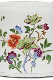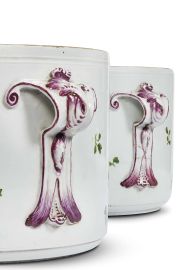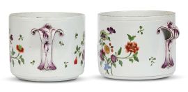 in porcellana dipinta in policromia, corpo cilindrico con manici applicati di forma arcuata e cardine allungato per consentire la presa; prive di coperchio. La policromia è piena e caratterizzata da fioretti verdi chiari, tipici di uno dei più antichi ornati orientali eseguiti in manifattura, cosiddetto “con fiori indiani”: rami disposti in modo asimmetrico che si dipartono dal centro, carichi di fiori diversificati, lumeggiati da elementi dorati; decoro a fiori orientali d’ispirazione cinese che giunse in manifattura tramite la mediazione delle porcellane tedesche ed europee in generale. Un interessante confronto ci deriva da una scatola con coperchio conservata al Museo di Düsseldorf e dalla coppia del museo di Villa Cagnola a Varese; una presenta sul fondo etichetta di collezione SILVIO FERRARA ROMA; alt. cm 16,3, diam. bocca cm 19,9, diam. base cm 16,9 e alt. cm 16,3, diam. bocca cm 20,7, diam. base cm 17,3