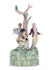 in porcellana dipinta in policromia, raffigurante una scena galante ambientata intorno ad un alberello posto sulle caratteristiche rocce dipinte con prevalenza di verde con tre figure, un uomo che suona una zampogna mentre un gentiluomo scherza con una donna seduta; alt. cm 23, diam. base cm 11,2