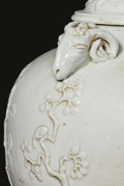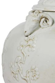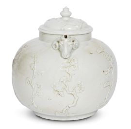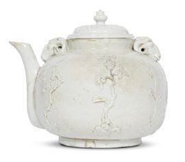 in porcellana, corpo globulare liscio dotato di coperchio piano con presa a trottola; il versatoio, cilindrico, si erge alto dalla pancia, mentre ai lati dell’imboccatura due piccole teste di ariete che servivano a sorreggere il manico, probabilmente costituito da un’anima metallica ricoperta da bambù intrecciato. Si tratta di un raro esempio di quella che è definita “con testa di ariete”, da sempre considerata rara e associabile alla prima sperimentale produzione della manifattura. Il decoro, che si limita ad alcuni sottili rami di pruno disposti verticalmente sul corpo della teiera, è quello che caratterizza il tentativo di imitazione di esemplari cinesi, il cosiddetto blanc de Chine, da parte di tutte le manifatture europee del periodo. Negli inventari della manifattura questo è il decoro probabilmente definito “bianca con rilievi di fiori e foglie” o forse “con fiori a basso rilievo”. Il confronto più vicino ci deriva dalla teiera con corpo a forma di zucca, bocca a collo d’oca, teste di ariete sulle quali s’innestava il manico e decoro coerente al nostro; alt. cm 18, largh. massima cm 21, diam. cm 17,5