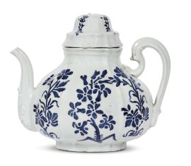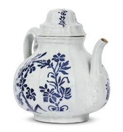 in porcellana, corpo globulare costolato, il beccuccio parte dalla pancia con un attacco sagomato e si erge alto e arcuato; l’ansa, da modello derivato dall’argenteria, è ricurva, sagomata e centinata. Il decoro in monocromo blu è distribuito simmetricamente sulle costolature e riproduce i motivi tipici dello stampino con rami fioriti ad andamento verticale. Il coperchio, coerente ma privo di pomolo, è sagomato alla base e si erge a cupola, con decoro allo stampino. La teiera per forma e caratteristiche tecniche e stilistiche trova riscontro nella prima produzione della manifattura; alt. cm 17,5, largh. massima cm 20,5, diam. cm 14,3