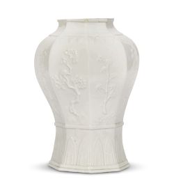 in porcellana, corpo a balaustro di forma ottagonale su alto piede a base piana, a potichè. Il decoro acromo è realizzato a rilievo con piccoli rametti di fiori pruno e motivo a foglie lanceolate sul piede. Di chiara ispirazione orientali, il vaso è ascrivibile per materia e gusto alla produzione del periodo iniziale della manifattura di Doccia. Due vasi con un’importante imboccatura estroflessa, molto vicini all’opera in esame, sono stati attribuiti alla manifattura toscana e datati al 1740-1742, ricordando nella relativa scheda come questa tipologia a potichè fosse prodotta come guarnizione da camino da diverse manifatture europee, al punto che trovano confronti in importanti opere variamente attribuite. La loro attribuzione a favore della fabbrica dei marchesi Ginori, per un periodo ascritte alla manifattura di Vezzi, ci confortano nell’attribuzione e datazione di questa nostra coppia, rafforzate anche dal confronto diretto con i fiori e con la qualità dell’impasto dei due vasetti presentati al lotto precedente; alt. cm 22,5, diam. cm 14,7