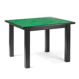 A TABLE, BLACK LACQUERED WOOD STRUCTURE, TOP COVERED IN GREEN LEATHER
