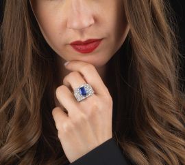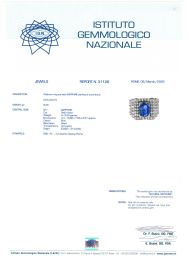 in platino, al centro uno zaffiro ceylon taglio ovale di ct 3.40 circa, circondato da diamanti taglio huit huit per ct 2.70 circa, punzoni 950, PT e del fabbricante, mis. 56, gr. 9. Corredato di certificato IGN del 08/03/2022 attestante l'origine e l'assenza di trattamenti termici.