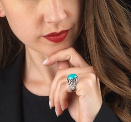 in oro bianco 18kt, sulla sommità un turchese taglio cabochon circondato da fasci di diamanti taglio brillante (uno mancante)per ct 1.10 circa, mis. 46, gr. 14
