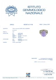 in platino, al centro una giadeite "A" color lavanda taglio cabochon di ct 8.49, affiancata da diamanti taglio trilliant e brillante per ct 0.39, punzone PT 900, mis. 49, gr. 9. Corredato di certificato IGN del 17/03/2022 attestante le caratteristiche.