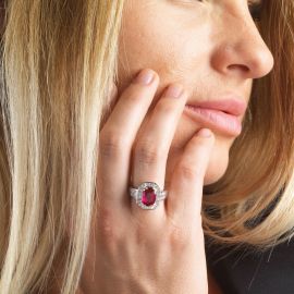 in oro bianco e giallo 18kt, al centro un rubino taglio ovale di ct 2.70 circa, circondato da diamanti taglio carré e princess per ct 1.90 circa, colore F/G, purezza IF/Vvs, punzone 750, mis. 53, gr. 8. Corredato di certificato IGN del 25/03/2022 attestante le caratteristiche.