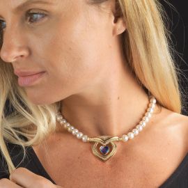 ANSUINI PEARL SAPPHIRE AND DIAMOND NECKLACE IN 18KT YELLOW GOLD
