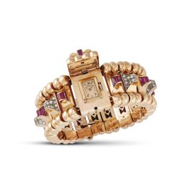 cassa in oro rosa 18kt, quadrante firmato "Universal Geneve", indici applicati, movimento a carica manuale, bracciale ad ampio binario in oro rosa 18kt e platino, composto da una serie di elementi acuminati impreziositi da rubini taglio baguette per ct 6 circa e da diamanti taglio huit huit per ct 4.80 circa, punzoni 18kt e "Platine", lungh. cm 18,5, gr. 156