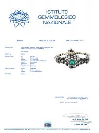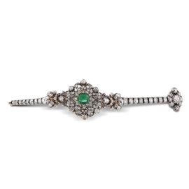 in oro e argento, composto da un elemento centrale amovibile con motivo a tralci impreziosito al centro da uno smeraldo colombiano taglio cuscino di ct 2.10 circa, circondato da diamanti taglio antico e a rosa per ct 11.50 circa, lungh. cm 16 circa, gr. 33. Corredato di certificato IGN del 12/10/2021 attestante le caratteristiche e l'origine della pietra.