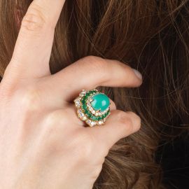 in oro giallo 18kt, al centro un turchese taglio cabochon di mm 12x10x7 circa, circondato da una doppia fila di diamanti taglio brillante per ct 1.70 circa e da smeraldi taglio rotondo per ct 0.70 circa, firmato "Bulgari", punzone 750, mis. 51, gr. 11
