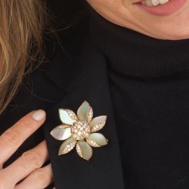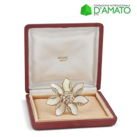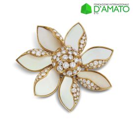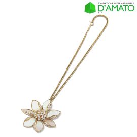 in oro giallo 18kt, catena a maglia groumette da cui pende una grande spilla a forma di fiore con petali in madreperla e impreziosita da diamanti taglio brillante per ct 5 circa, firmata "Bulgari Roma", punzoni francesi, punzoni 750 e del fabbricante, dim. spilla cm 6x6, lungh. collana cm 40, chiusura a moschettone, gr. 40 complessivi. Corredata di scatola.