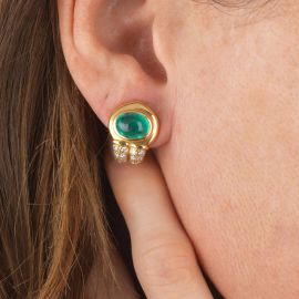 in oro giallo 18kt, impreziositi da due smeraldi taglio cabochon per ct 4 circa e da diamanti taglio brillante per ct 0.30 circa, firmati "Bulgari", punzoni 750 e del fabbricante, chiusura a clip, gr. 11 complessivi