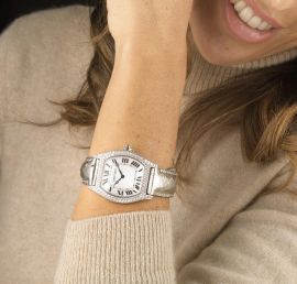 cassa in oro bianco 18kt, fondello serrato con viti e con movimento a vista, lunetta e anse impreziosite con diamanti, quadrante bianco firmato Cartier, grafica nera, numeri romani, movimento a carica manuale Cartier 430 MC, cinturino in pelle argentata, lungh. interna cm 18 circa, chiusura deployant in oro bianco18kt marcata Cartier, vetro minerale, gr. 79. Dim. mm 33x34