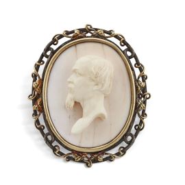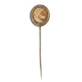 in argento e oro, di cui una di forma ovale con motivo a tralci recante al centro un cammeo in calcedonio raffigurante il profilo di un uomo a rilievo inciso, dim. cm 5x6 circa, accompagnato da uno spillone con cammeo in agata raffigurante il profilo di Jupiter entro cornice, dim. cm 2,5x9,5, gr. 43 complessivi