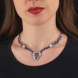 in platino, composto da boules di zaffiri di mm 5 circa, pendente/spilla e distanziali impreziositi da zaffiri, rubini e smeraldi incisi a forma di foglia, diamanti taglio baguette e brillante per ct 4.90 circa, scomponibile in spilla e coppia di bracciali, lungh. collana cm 41, lungh. bracciali cm 18, dim. spilla cm 2,5x3, gr. 68