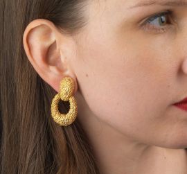in oro giallo 18kt, con superficie lavorata a cera persa, punzoni 18kt e del fabbricante, dim. cm 2,5x4, chiusura a clip, gr. 27 complessivi
