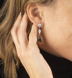 in oro bianco 18kt, impreziositi da due diamanti taglio brillante per ct 1.80 circa, due damanti taglio navette per ct 1.50 circa e due diamanti neri taglio a goccia, punzone 750, lungh. cm 4 circa, chiusura a farfallina, gr. 8 complessivi