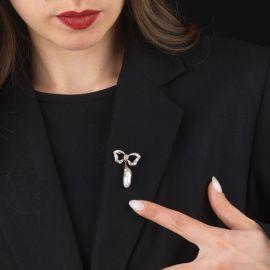 PICCOLA SPILLA A FIOCCO CON BOLLA PERLACEA E DIAMANTI