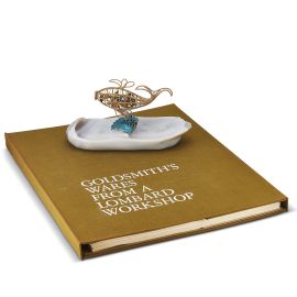 base in calcedonio, su cui poggia una struttura a forma di grande pesce in oro giallo 18kt con lavorazione a cordicella di cm 13,5x10 circa, contenente all'interno dei piccoli pesci in smalti policromi, dim. cm 22x10x11,5, gr. 1046 complessivi. Corredato di libro in tela editoriale con illustrazioni a colori in tavole fuori testo che presentano le splendide creazioni di gioielli e soprammobili-gioiello del lombardo Romolo Grassi, maestro orafo e gioielliere del XX secolo.