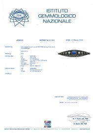 in oro e argento, lavorata a traforo con al centro uno zaffiro birmano taglio ovale di ct 2.40 circa, affiancato da diamanti taglio antico e huit huit per ct 0.50 circa, dim. cm 6x1,5, gr. 9. Corredata di certificato IGN del 17/03/2022 attestante l'origine della pietra e l'assenza di trattamenti termici.
