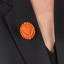 montatura in oro 18kt, composta da un cammeo in corallo inciso centrale raffigurante il volto di Bacco, circondato da una fila d sfere in corallo digradanti di mm 6-4 circa, dim. cm 3,5x4, gr. 21