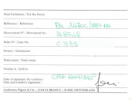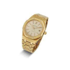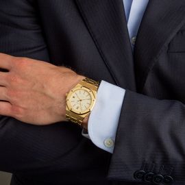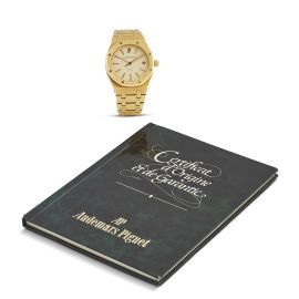 cassa monoblocco in oro giallo 18kt, fondello serrato con viti, ghiera ottagonale in oro giallo, quadrante avorio "Tapisserie" firmato AP, indici oro applicati al superluminova, movimento a carica automatica n. 348548, bracciale a maglie in oro giallo 18kt, lungh. interna cm 18 circa, chiusura in oro giallo 18kt deployant a scomparsa marcata Audemars Piguet, vetro minerale, gr. 141. Diam. mm 36. Corredato di scatola service, garanzia e libretti.