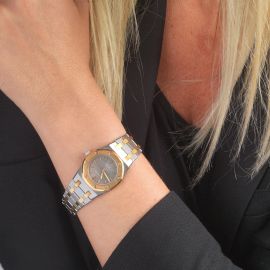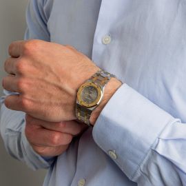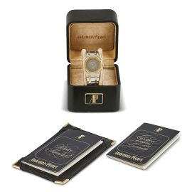 cassa in acciaio, fondello serrato con viti, lunetta in oro giallo 18kt con viti, quadrante ardesia firmato AP, indici oro applicati, movimento a carica automatica, bracciale in acciaio e oro giallo 18kt, lungh. interna cm 19 circa, chiusura a scomparsa marcata Audemars Piguet, vetro minerale, gr. complessivi 86. Diam. mm 29. Corredato di scatola e garanzia.