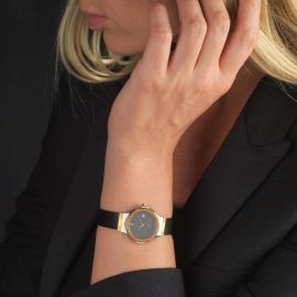 cassa in acciaio, fondello serrato con viti, ghiera in acciaio dorato con viti, quadrante nero firmato Hublot, grafica oro, datario a ore tre, movimento al quarzo, cinturino originale in plastica di colore nero, chiusura doppia deployant in acciaio dorato firmata Hublot, vetro minerale. Diam. mm 30