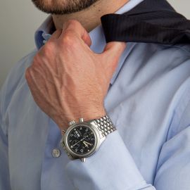 cassa in acciaio, fondello a vite, tasti a pompa, tasto per seconda lancetta del crono a ore dieci, corona marcata, quadrante nero firmato IWC, grafica bianca, numeri arabi in bianco e indici al trizio, contatore dei secondi a ore nove, contatore dei minuti a ore dodici, contatore delle ore alle sei, datario con doppia finestra per giorno e data del mese a ore tre, movimento a carica automatica, bracciale a maglie in acciaio, chiusura originale a scomparsa, vetro minerale. Diam. mm 41
