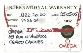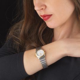 cassa in acciaio, fondello a scatto, corona marcata, lunetta in oro giallo con numeri romani, quadrante madreperla con logo Omega applicato, grafica nera, indici applicati color oro, datario a ore tre, movimento al quarzo, bracciale in acciaio, lungh. interna cm 17, chiusura a scomparsa firmata Omega in acciaio, vetro minerale. Diam. mm 27. Corredato di garanzia.