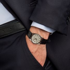 cassa in oro bianco 18kt, fondello a scatto, lunetta liscia in oro bianco 18kt, corona marcata, quadrante argenté firmato Patek Philippe, indici applicati, secondi a ore sei, movimento a carica manuale, cinturino originale in pelle, fibbia originale in oro bianco 18kt, vetro minerale. Diam. mm 30