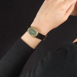 cassa di forma ovale in oro giallo 18kt, fondello serrato con viti, lunetta liscia in oro giallo 18kt, quadrante in pietra dura verde firmato Piaget, grafica oro, numeri romani, movimento a carica manuale cal 9P n. 690744, cinturino in pelle nera originale, fibbia in oro giallo 18kt marcata Piaget, vetro minerale, gr. complessivi 29. Dim. mm 25x32
