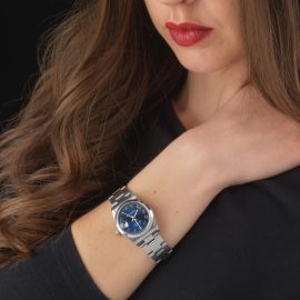 cassa in acciaio, fondello a vite, corona marcata, lunetta liscia in acciaio, quadrante blu, grafica bianca, numeri romani applicati color argento, datario a ore tre con lente cyclope, movimento a carica automatica cal 2235 n. 1860211, bracciale oyster in acciaio ref. 78350 finali 551B, lungh. interna cm 17 circa, chiusura a scatoletta in acciaio marcata Rolex, vetro minerale. Diam. mm 31. Corredato di garanzia.
