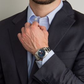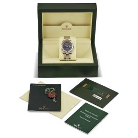 cassa in acciaio, fondello a vite, corona marcata, ghiera bidirezionale zigrinata in acciaio, quadrante blu firmato Rolex, indici applicati al superluminova, datario in rosso a ore tre con lente cyclope, movimento a carica automatica cal 3135 n. 31265072, bracciale oyster in acciaio ref. 72200 finali EO, cod. produzione EO7, lungh. interna cm 20 circa, chiusura originale a scatoletta, vetro minerale. Diam. mm 36. Corredato di scatola e garanzia.
