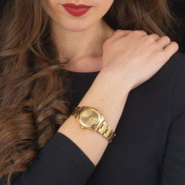 cassa in oro giallo 18kt, fondello a vite, corona marcata, ghiera zigrinata in oro giallo 18kt, quadrante champagne firmato Rolex, grafica nera, indici oro applicati, movimento a carica automatica cal 2130 n. 029941, bracciale oyster a maglie rivettate in oro giallo 18kt ref. 7205 finali 51, lungh. interna cm 17 circa, chiusura a scatoletta in oro giallo 18kt marcata Rolex, vetro minerale, gr. 85. Diam. mm 31. Corredato di scatola non coeva e maglia aggiuntiva.