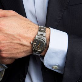 cassa in acciaio, fondello a vite, corona marcata, ghiera liscia in acciaio, quadrante explorer antracite firmato Rolex, grafica oro, indici e numeri arabi applicati, datario a ore tre in rosso, movimento a carica manuale, bracciale oyster a maglie ripiegate in acciaio ref. 7835 finali 251, chiusura a scatoletta firmata Rolex, vetro plastica bombato. Diam. mm 31