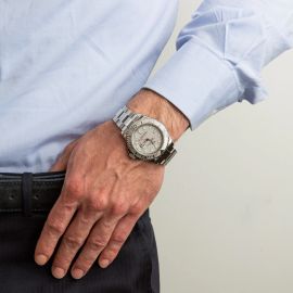 cassa in acciaio, fondello a vite, corona marcata, ghiera bidirezionale in acciaio satinato, quadrante argento effetto glitter firmato Rolex, grafica nera e scritta Yachtmaster in rosso, indici bicchierini al superluminova, datario a ore tre con lente cyclope, movimento a carica automatica cal 3135 n. 30611740, bracciale oyster in acciaio satinato e lucido a maglie piene ref. 78760 finali MA, cod. produzione MA1, lungh. interna cm 19 circa, vetro minerale. Diam. mm 40. Presente pellicola su fondello.