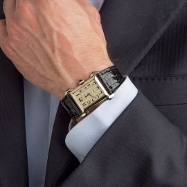 cassa di forma in oro bianco 18kt, fondello a scatto, lunetta liscia in oro bianco 18kt con anse snodate impreziosite da zaffiri, quadrante argenté firmato Tavannes, grafica nera, numeri arabi stampati, corona con zaffiro cabochon, secondi a ore sei, movimento a carica manuale cal 814, cinturino in pelle nera, fibbia in oro bianco 18kt, vetro plastica. Dim. mm 23x40