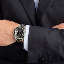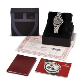 cassa in acciaio, fondello a vite, corona marcata e tasti a vite, ghiera con inserto nero e scala tachimetrica a "500", quadrante nero firmato Tudor, grafica bianca, numeri arabi in bianco effetto 3D, contatore dei secondi a ore nove, contatore dei minuti a ore dodici, contatore delle ore alle sei, movimento a carica automatica cal 7750, bracciale a maglie in acciaio lucido e satinato ref. 62490 finali 632, cod. produzione AB4, lungh. interna cm 20 circa, chiusura a scatoletta marcata Tudor, vetro minerale. Diam. mm 40. Corredato di scatola e garanzia.