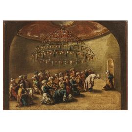 Riscoperte nella seconda metà del Novecento da Antonio Morassi e oggetto di una mostra organizzata alla Fondazione Cini da Alessandro Bettagno, le “scene turchesche” di Antonio Guardi (solo una trentina delle quarantatre sono oggi rintracciate) si ispirano, come precisato anche da Rodolfo Pallucchini (La pittura nel Veneto. Il Settecento, Milano 1996, II, pp. 21-23) alle illustrazioni del Recueil de cent estampes représentant différentes nations du Levant, pubblicato per la prima volta nel 1712, riproducenti invenzioni di Jean Baptiste van Mour, pittore di Valenciennes trasferitosi a Costantinopoli nel 1699 e nominato pittore di corte nel 1727.