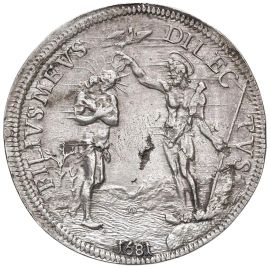 Ar gr. 31,26 D/ Busto a d. con lunga capigliatura; sotto la spalla data R/ Scena del battesimo; es. data MIR 328 Di Giulio 121 Pucci 38