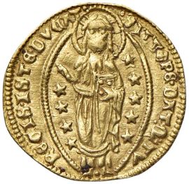 Au gr. 3,50 D/ San Marco porge il vessillo al Doge genuflesso R/ Il Redentore entro un’aureola ellittica stellata Mont. 143 Paol. 1 Fr. 1230