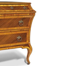 lastronato in legni vari di forma a urna, piano rettangolare profilato da cornice in legno chiaro, fronte a due cassettini appaiati di linea svasata sotteso da due cassetti mossi, cassetti e lati lastronati analogamente al piano, gambe mosse terminanti a ricciolo stilizzato, cm 88,5x131,5x57