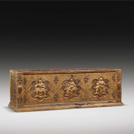 in legno e pastiglia dorata e policroma, il fronte presenta tre formelle quadrilobe e mistilinee raffiguranti le virtù cardinali intervallate da decori a gigli, paraste con decori con gigli e scudi, i fianchi decorati con stemmi gentilizi, cm 51x155x48