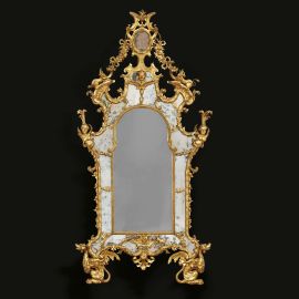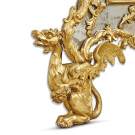 in legno intagliato e dorato, a doppia fascia, quella interna di forma centinata, e quella esterna sagomata e profilata da volute e decori, con cimasa a timpano spezzato con erma femminile sostenente elemento a medaglione contornato da festoni discendenti in decori in foggia di drago che a loro volta discendono sui fianchi in erme femminili alate, gli angoli inferiori presentano draghi accucciati a sostenere la specchiera con il dorso, cm 259x134