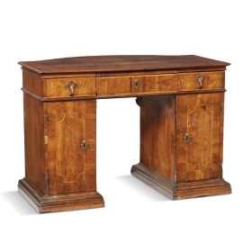 lastronata in noce e radica con filettature in legno chiaro, piano di linea sagomata sul fronte ornato da due riserve mistilinee, retro a tre cassetti sottopiano dei quali il centrale più largo e i laterali sottesi da due sportelli, fronte bombato con grembiale intagliato a volute, tutta la superficie ornata da riserve mistilinee analoghe a quelle del piano, base modanata, cm 80x122x70