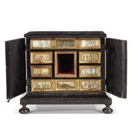 STIPO, LOMBARDIA, SECOLO XVIIIin legno ebanizzato, con due ante a celare sei cassettini di cui due formati da tre piccole cornici con scene di cavalieri e un cartiglio e la seconda con scene analoghe e piccolo specchio, vano centrale estraibile celante segreto affiancato da due cassettini con scene rurali su carta, cm 27,5x32x20