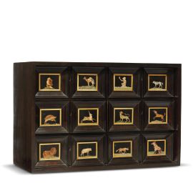 in legno ebanizzato, fronte a sei cassetti disposti su due colonne ciascuno dei quali ornato da due formelle in pietre policrome a raffigurare animali entro cornici modanate, cm 62,7x95,5x37, completo di base a un cassetto sottopiano, cm 74,5x95,5x41,5